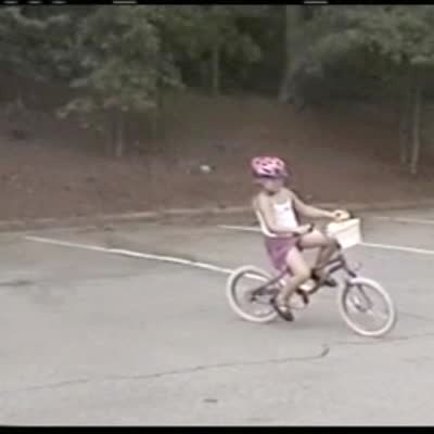 Girl learning to ride her bike is doing great. Then she rides straight into the back of a pickup truck for no reason. No tail - camera goes off girl, she cries.