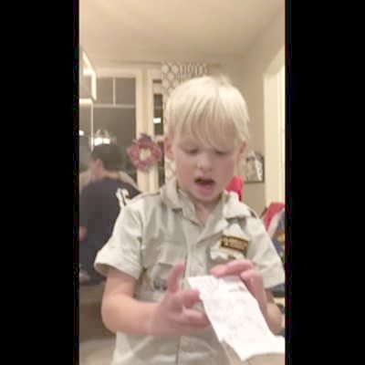 A young boy screams with excitement when he got his first receipt for Christmas.