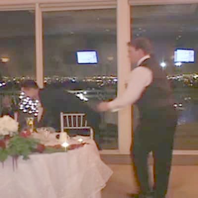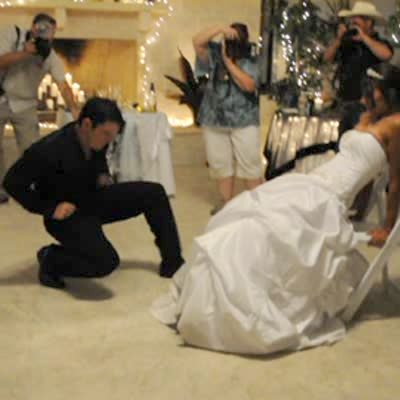 A groom tries to do a sexy dance for his bride, as she sits on the dance floor at their wedding reception, when he attempts a hand-stand but kicks her in the head instead. She then falls out of the chair. Featured talent cleared (bride and dancing groom). Music rights not cleared.