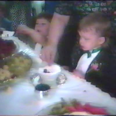 "Tuxedo Tot" Young boy speaks into microphone at wedding reception & says he looks cute in his tuxedo. Kids say.
