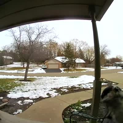 A teen boy rings the doorbell on the front porch. A dog opens the door and the screen door smacks the boy in the face as the dog runs out. Security Footage.