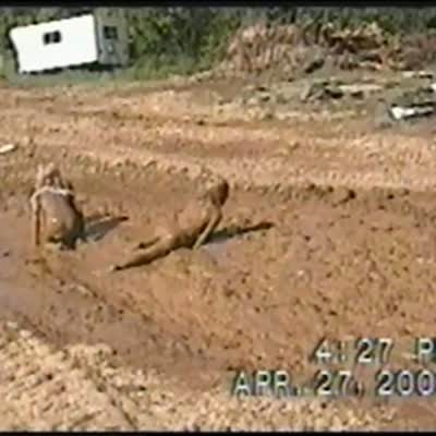 Woman goes down a large homemade water slide so fast she slides all the way through the landing area into some mud. With recovery.
