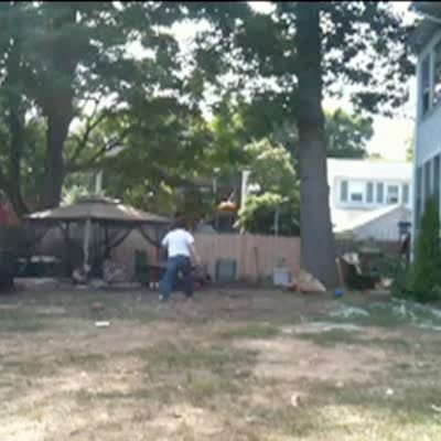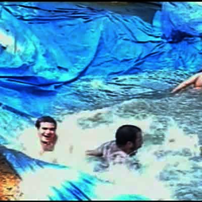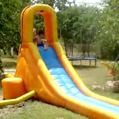 Boy is getting ready to slip & slide & just before he does, a dog pees on it. Boy still goes & slides into pee. Gross. Summer.