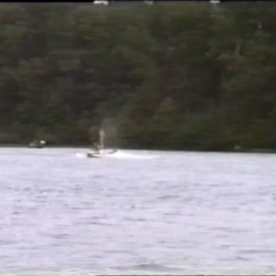 People are tubing on a lake. A guy flips from one tube and into another at 0:12.