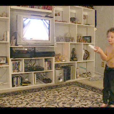 Little boy falls flat on his back playing the Wii. NO AUDIO.