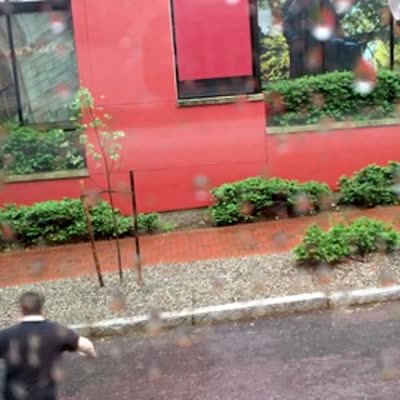 A man dances while it rains in a parking lot and grabs a lamppost and swings around it, but the lamppost breaks and comes out of the ground.