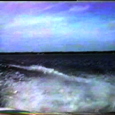 Woman inner tubing behind boat, at a good speed; good wipe out.