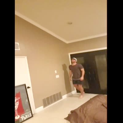Two men try to recreate the Dirty Dancing move - as one jumps into the other's arms. They fall over and one lands on top of the other's head in the kitchen.