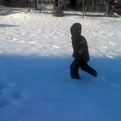 A boy runs in the snow and jumps up to fall on his back to recreate a Charlie Brown joke.