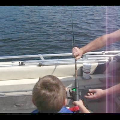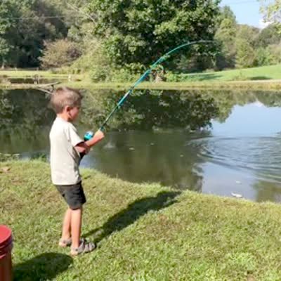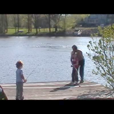 Boy doesn't want to touch a fish while dad reels it in. The fish moves & scares boy.