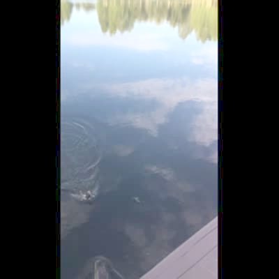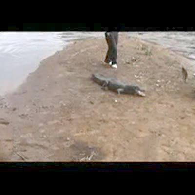 Woman catches a fish & when she reels it in, a small alligator crawls out of the water chasing after the fish.