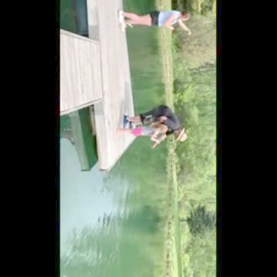 On a dock by a lake, a man tries to help a girl cast her fishing pole. She throws it into the lake. A young boy watches. Caucasian.