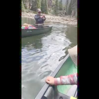 A fish jumps into a man's kayak as he is fishing. In regular speed and slow motion.