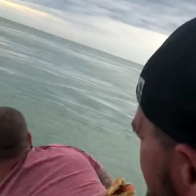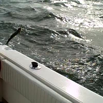 A man on a boat reels in a fish. The man behind the camera asks, "What was the secret Connor?" The man reeling in the fish, swings his rod up and a fish flies at the camera. The camera man laughs.