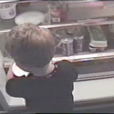 Black dog is caught sneaking into the refrigerator & pulling a slice of pizza from takeout box, walks off-camera with it. Hidden camera. Dog comes back but there's no more to steal.