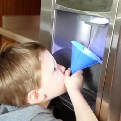 A teen girl in a kitchen holds a cup to a refrigerator water dispenser and asks another teen girl if she wants some water. She presses the lever, water shoots out, and the camera pans down to show the second girl lying on the floor and the water falling into her mouth while she laughs.
