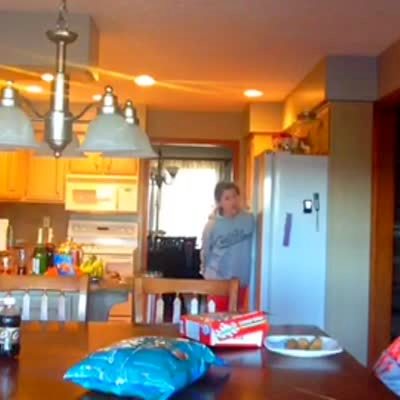 A man stands on a stool to get into a cabinet above a refrigerator, when his foot slips and he takes a major fall onto the kitchen floor. His young daughter asks if he's okay then says, "We don't stand on chairs." Security footage.