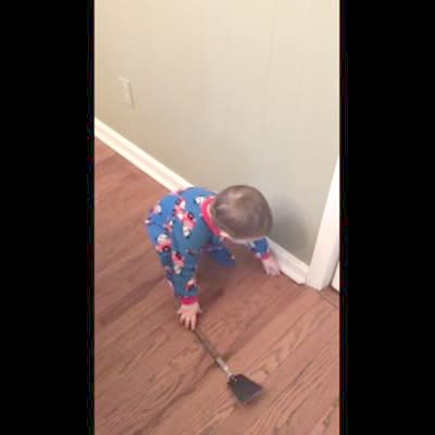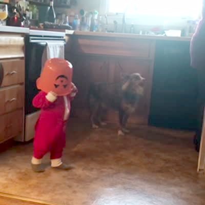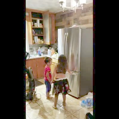 A young girl dances to "Birthday" by The Beatles in the kitchen, then a man slips and falls into the fridge when he runs over to join her.