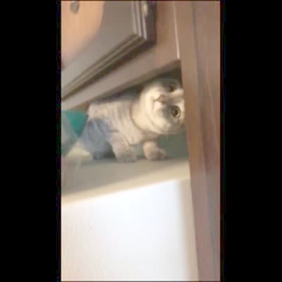 A woman tells a cat that she is not supposed to be on the top of the refrigerator. The cat then falls down behind the refrigerator.