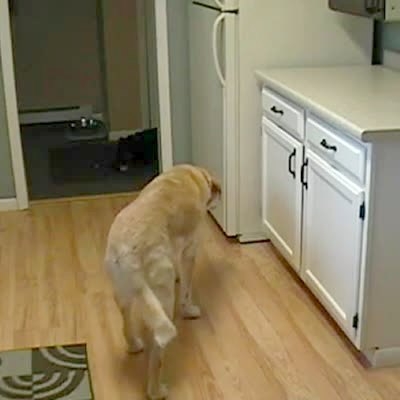"Cold-Blooded Canine" Big dog opens refrigerator door & takes out food, then pulls out an entire shelf, leaving the fridge almost empty. Destroys fridge. Hidden camera. Blurry camera. Long for edit. Needs pull ups