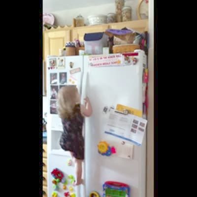 A tot girl climbs up the handles of a refrigerator to reach candy on top before she slides back down.