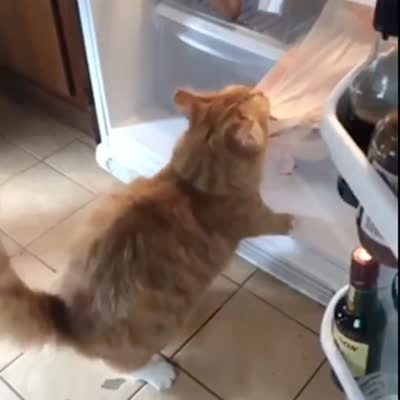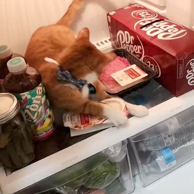 A cat grabs a bag of crab legs out of the refrigerator and drags it around the house.