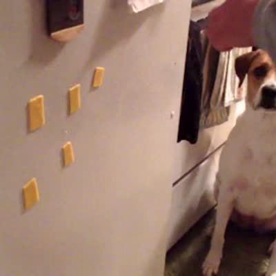 A fat dog opens fridge and tries to take food out. Gets caught and runs away. Beagle. Start at 0:35.