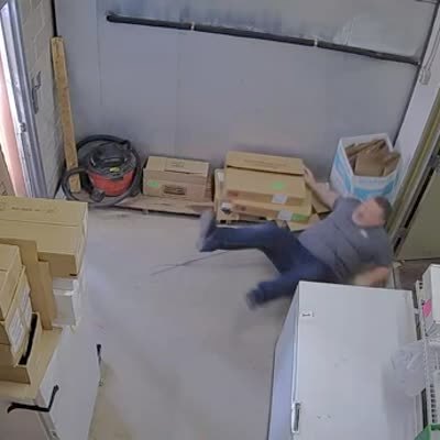 A man tries to move a freezer through a door, then the strap breaks and he falls backwards. Security camera footage.