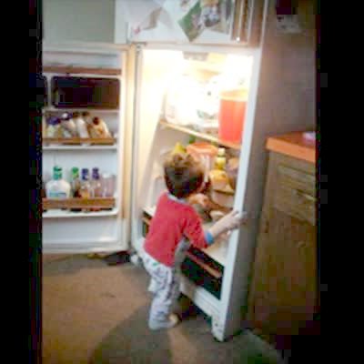 18 month old boy plays in the fridge. He climbs a drawer and then falls, bringing the drawer down on top of him.