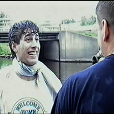 2 teen boys rehearse a scene at bar. 1 boy hits the other in the head with a root beer bottle.