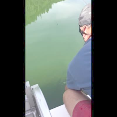 As a young man jumps out of a boat into the water, he accidentally smacks his head against the camera in his hand. No appearance release for the black man in blue shorts.