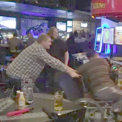 A man pushes another man in wheelchair towards the punching game at a bar. Featured talent cleared only (people sitting at the bar in the background not talent released)