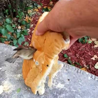 A bird gets stuck in a loaf of bread and a man releases it in a yard. Secondary source.