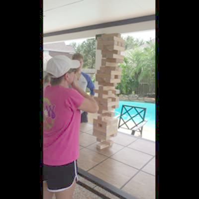 A woman removes a Jenga game block from the tower and it falls down and breaks the glass table it is on.
