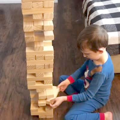 A young boy pulls a block out while he plays a giant jenga in the living room and the tower tips over and falls on him.