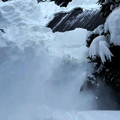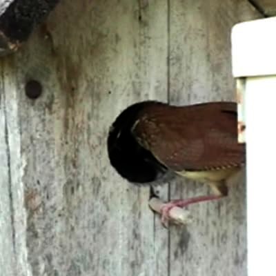 A man tries to remove a bird's nest from the rafters of his porch. A bird flies out of the nest and the man is startles and falls off of the ladder onto the floor below. Security footage.