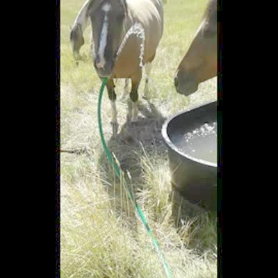 A horse removes a hose from a water bucket and drinks directly from the hose.