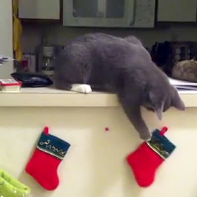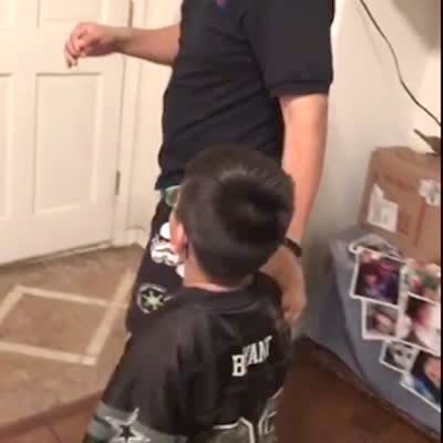 A man does the water bottle prank on a young girl in the kitchen, but when he removes the towel she squeezes the bottle to play the trick on him instead.