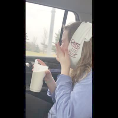 A teen girl rides in a car after wisdom teeth surgery and cries because there's holes in her mouth and she holds a milkshake and says to her mom "AND ALL I GET IS THIS?! MY TEETH GRINDED UP?!"