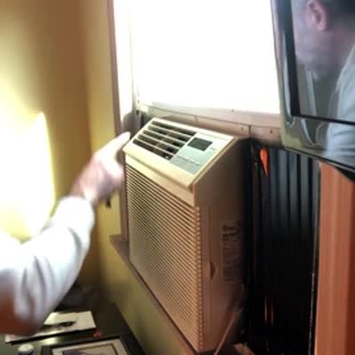 A man films himself as he takes an air conditioner out of a window but it falls through the window. He closes the window and says "all done".