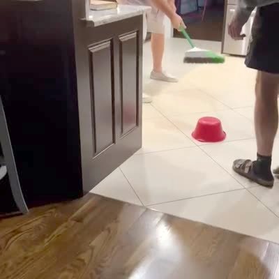 A young man and a senior man work to remove a bowl with a mouse underneath in a kitchen. The young man flips the bowl and runs, then they see that it was a computer mouse. Computer Mouse in the House