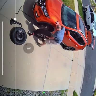 A man removes the front left tire from his car. When the tire is off, the car then rolls back down out of his driveway and into the street, as metal squeals on the pavement. Security footage.