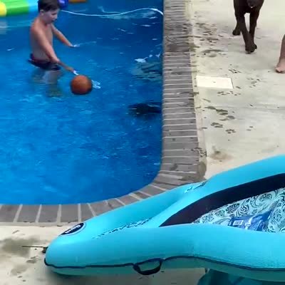 A young boy uses a net to lift a turtle out of a pool, and the turtle immediately jumps back into the water.