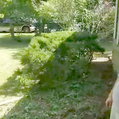 A man stands next to a bush in a yard and another person in a truck off-screen drives a truck with a rope attached the bush. The rope pulls on the bush then snaps and flies off and hits the man.