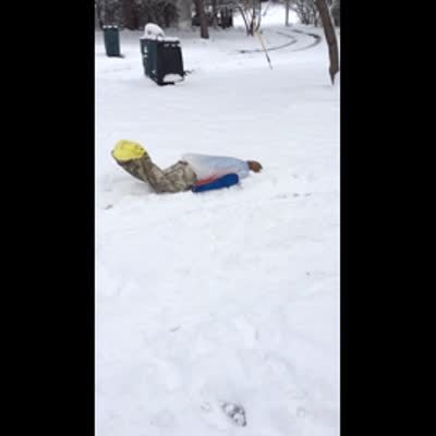 A boy wiggles through the snow on his stomach outdoors and resembles a worm.