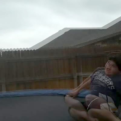 A teen boy in a yard jumps and flips on a trampoline and loses his balance and rolls backwards and falls off the trampoline. He says "I'm okay!"