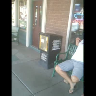 Boy hides in newspaper dispenser outside of restaurant, scares grandma when she opens door. Pranks/scares.