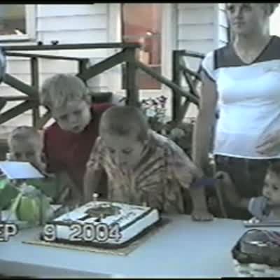 While people at birthday party are trying to put out trick candles, tot boy takes plastic cake slicer and scoops up some frosting. He walks away to eat his frosting without anyone noticing. Sits on steps & on porch.