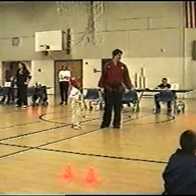Young boy in karate tournament gets ready to spar. When man says go one boy runs away instead of fighting. he does that twice and then finally spars with the other boy