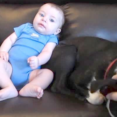 "Diaper Dodging Dog" A baby boy sits on a chair leaning on a sleeping dog. The baby boy poops in his diaper, the dog runs off the chair, and the baby boy falls over onto the chair. Caucasian.